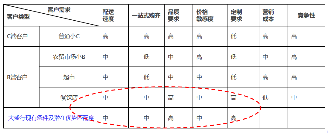 大盛行的核心優(yōu)勢(shì)來自科朗的“芯片級(jí)”育種優(yōu)勢(shì),能根據(jù)不同菜肴,從源頭品種上滿足對(duì)肉禽地道品種的要求,滿足客戶對(duì)肉禽菜肴正宗口味的要求。但在配送速度和品類齊全度方面,略顯不足。相比之下,餐飲類客戶對(duì)品質(zhì)和品類及配送速度的需求,與大盛行現(xiàn)有條件剛好匹配,能實(shí)現(xiàn)大盛行的戰(zhàn)略機(jī)會(huì)最大化。
